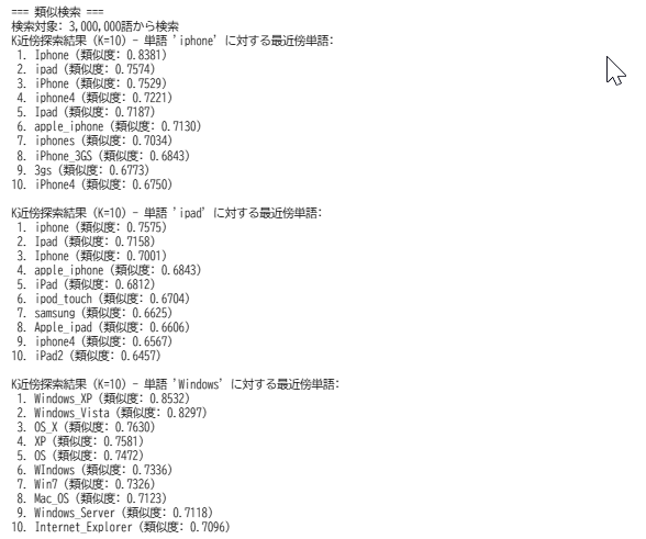 【概要】fastTextライブラリを用いて日本語単語の300次元ベクトル表現を取得し、コサイン類似度計算や類似語検索を行うプログラムである。辞書にない新語にも対応し、単語埋め込み技術の動作原理を実践的に学習できる。