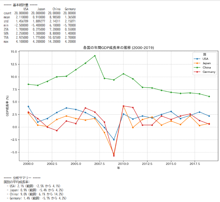 - 主要4カ国のGDP成長率分析(2000-2019)(折れ線グラフと基本的な統計量)