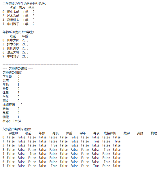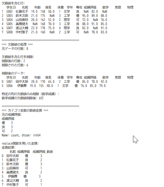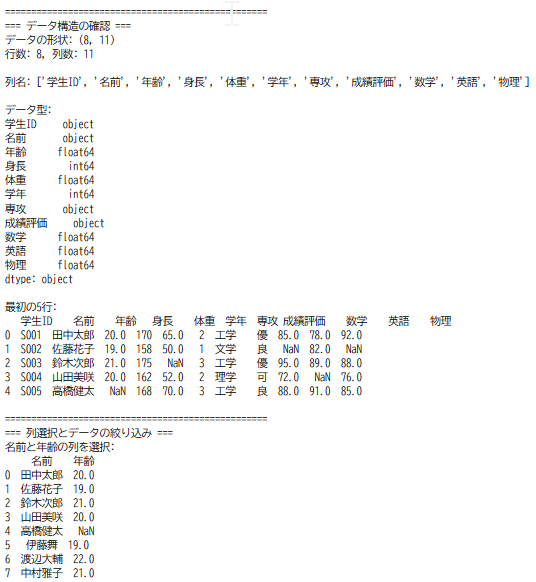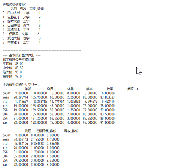 - 表形式データの処理と分析:DataFrame操作、欠損値処理、統計量算出、可視化