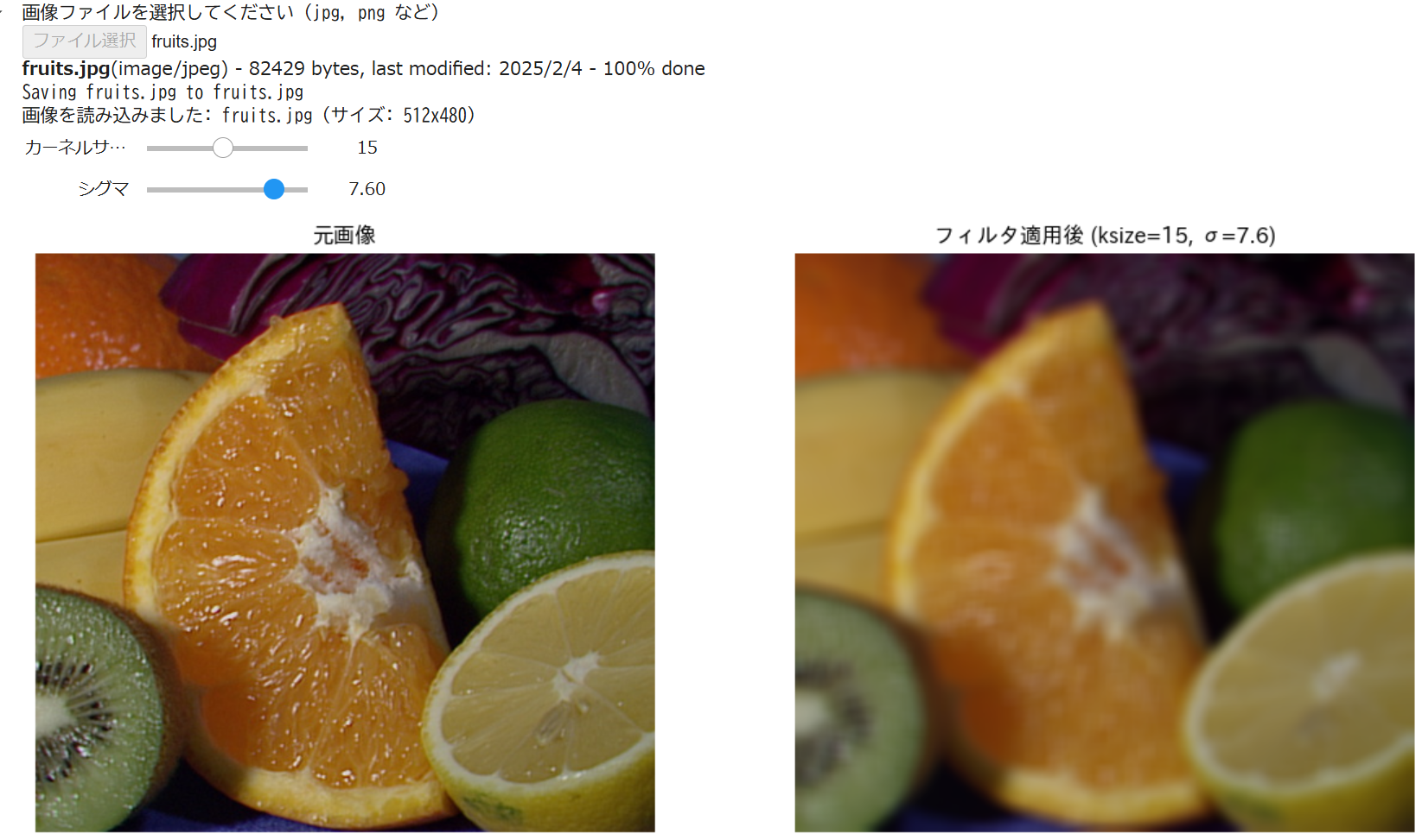 【概要】Google Colab上でガウシアンフィルタのパラメータ(カーネルサイズとシグマ)をスライダーで調整し、元画像とフィルタ適用後の画像を表示する。ガウシアンフィルタの動作原理やパラメータを学ぶ教育目的に有用。リアルタイムで結果が更新され、パラメータの影響を直感的に理解できる。