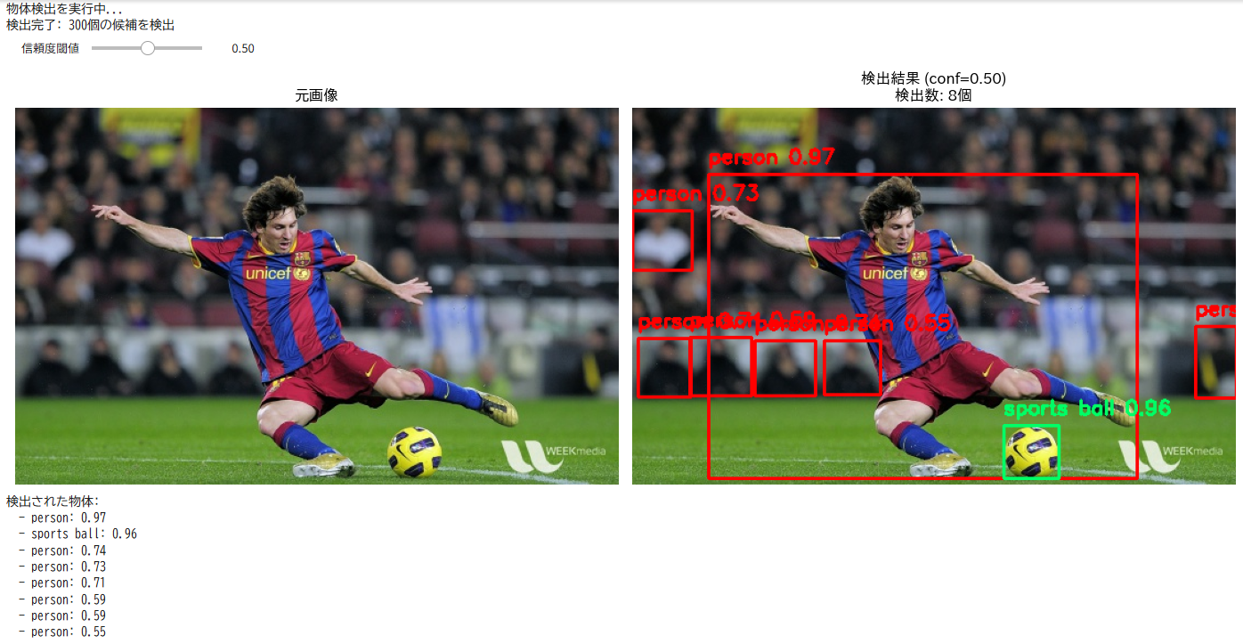 【概要】 Google Colabで動く物体検出AI(RT-DETRv2)。人・車・動物など80種類を検出。画像をアップロード後、スライダーで信頼度閾値を調整、リアルタイムで検出結果を確認。誤検出と見逃しのトレードオフを理解。