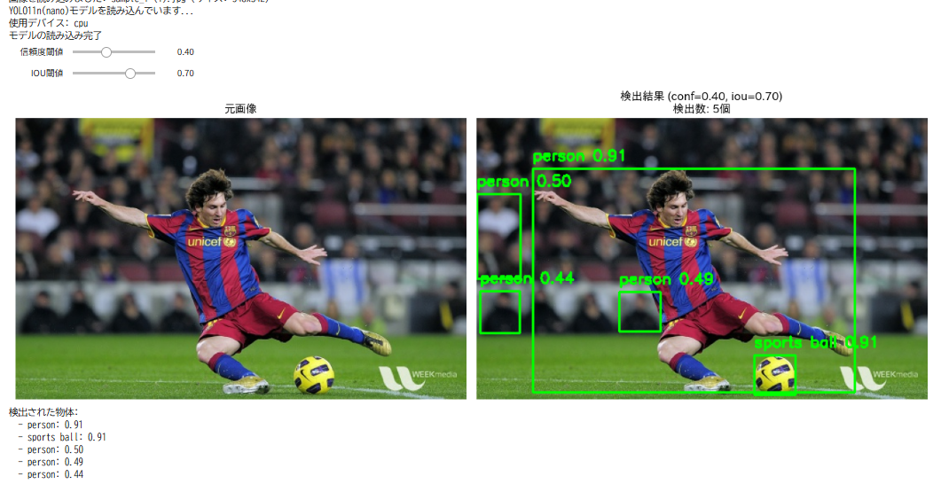 【概要】Google Colabで動く物体検出AI(YOLO11)。人・車・動物など80種類を検出。画像をアップロード後、スライダーで信頼度閾値とIOU閾値を調整、リアルタイムで検出結果を確認。誤検出と見逃しのトレードオフを理解。