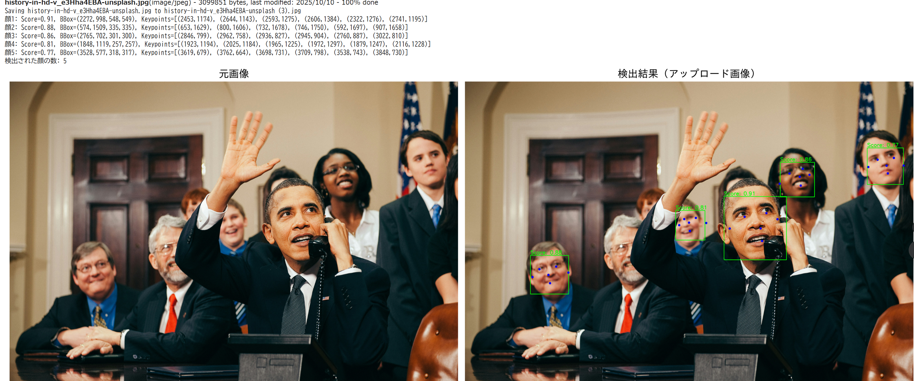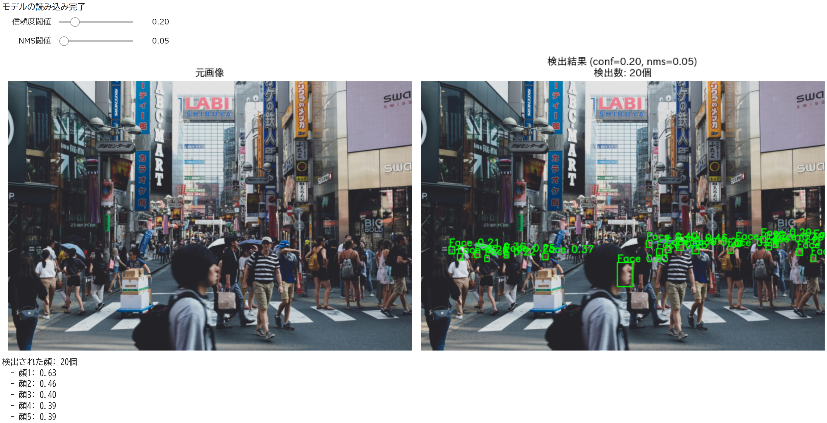 【概要】 Google Colabで動くInsightFaceのSCRFD 500Mモデルを使用した顔検出プログラム。 スライダーで信頼度閾値とNMS閾値を調整し、パラメータが検出結果に与える影響を確認できる。顔検出技術の実験や検証、パラメータチューニングの学習に活用できる。