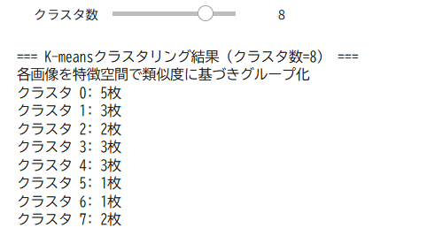 【概要】DINO ViT-S/16モデルを用いて画像から視覚特徴を抽出し、K-meansクラスタリングにより自動的にグループ化するプログラムです。ラベル付けなしで画像の視覚的類似性に基づいた分類を実現し、結果を3次元散布図とグリッド表示で視覚化します。