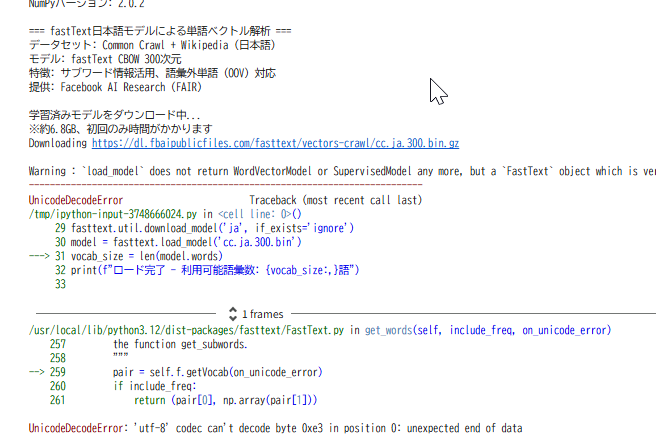 - 現在デバッグ中. fastTextを使用した日本語単語の特徴ベクトルと類似検索の Colab プログラムによる実験・研究スキルの基礎