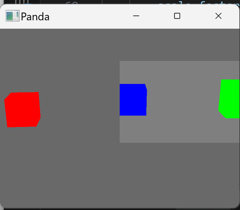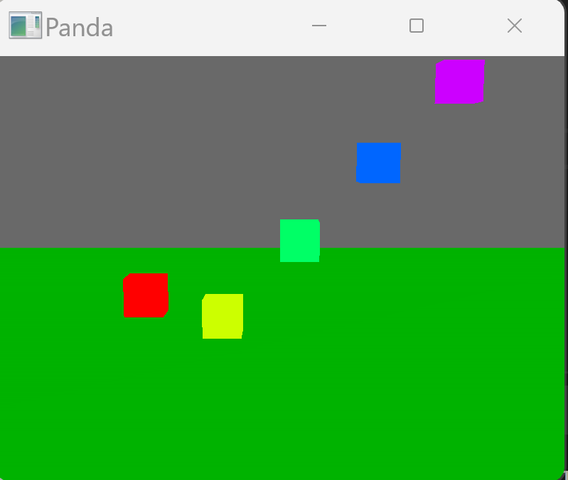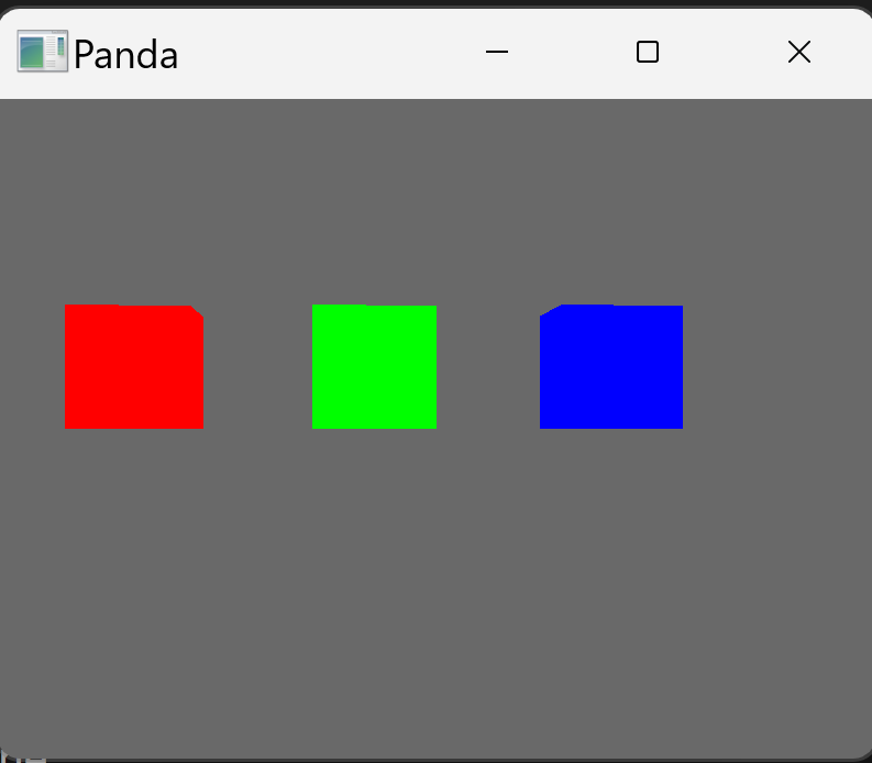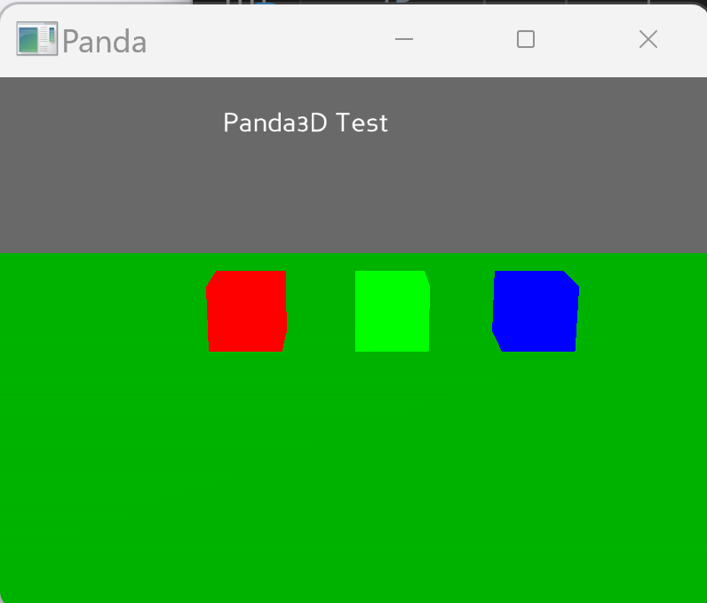 Panda3Dで3Dシーンを構築するプログラム。緑色の地面(平たい直方体)を配置し、その上に色相環に基づく3色(赤・緑・青)の立方体を横一列に並べる。全てのオブジェクトはテクスチャなしの単色表示。カメラは斜め後方から3つの立方体全体を見渡す位置に配置し、画面左上に「Panda3D Test」のテキストを表示。