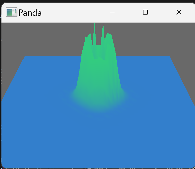 Panda3Dで波動方程式に基づく水面シミュレーションにマウスピッキングによるインタラクション機能を追加したプログラムである。50×50の格子点で構成されるメッシュを動的に生成し、各格子点の高さを波動方程式の数値解法(有限差分法)で計算することでリアルタイムに波の伝播を再現している。初期状態として格子中央に高さ5.0の山を配置し、そこから波紋が広がる。Ctrl+マウスクリックにより、カメラからマウス位置へのCollisionRayを発射し、水面メッシュとの衝突点を検出する。衝突点のワールド座標をグリッド座標に変換し、該当する格子点の高さに5.0を加算することで、任意の位置に新たな波を生成できる。ラプラシアン(2次空間微分の離散近似)と時間積分により各点の加速度と速度を求め、減衰係数を適用することで波が徐々に収束する物理的挙動を表現している。格子端は固定境界条件(高さ0に固定)として処理される。メッシュの頂点色は高さの絶対値に応じて対数スケールで変化し、微細な波の動きを視覚的に強調している。