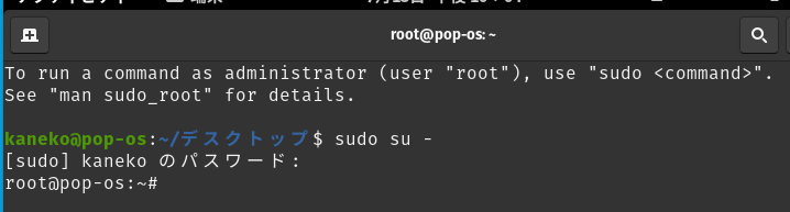 端末を開き,「sudo su -」を実行し,「passwd」を実行して, 特権ユーザのパスワードを設定する(同じパスワードを2回入力する).