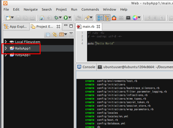 - いま作成した Rails プロジェクトが,Project Explorer ウインドウに表示されるので確認