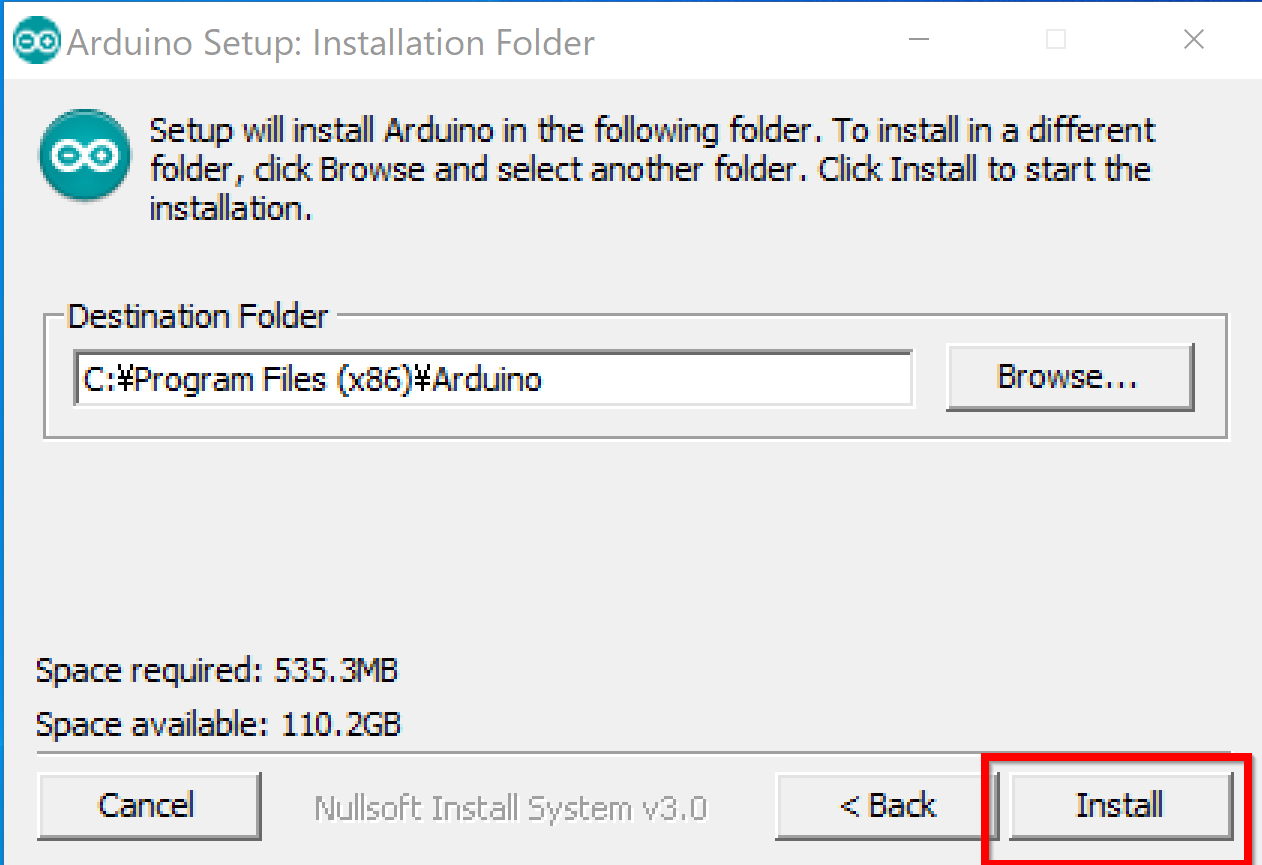 インストール先の指定: Arduino IDEをインストールするフォルダを指定する。通常はデフォルトの場所で問題ない。変更する場合は「Browse...」などで指定し、「Install」などをクリックする。