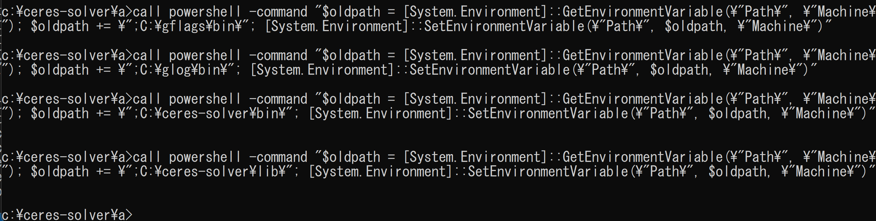 powershell -command "$oldpath = [System.Environment]::GetEnvironmentVariable(\"Path\", \"Machine\"); $oldpath += \";C:\gflags\bin\"; [System.Environment]::SetEnvironmentVariable(\"Path\", $oldpath, \"Machine\")" powershell -command "$oldpath = [System.Environment]::GetEnvironmentVariable(\"Path\", \"Machine\"); $oldpath += \";C:\glog\bin\"; [System.Environment]::SetEnvironmentVariable(\"Path\", $oldpath, \"Machine\")" powershell -command "$oldpath = [System.Environment]::GetEnvironmentVariable(\"Path\", \"Machine\"); $oldpath += \";C:\ceres-solver\bin\"; [System.Environment]::SetEnvironmentVariable(\"Path\", $oldpath, \"Machine\")" powershell -command "$oldpath = [System.Environment]::GetEnvironmentVariable(\"Path\", \"Machine\"); $oldpath += \";C:\ceres-solver\lib\"; [System.Environment]::SetEnvironmentVariable(\"Path\", $oldpath, \"Machine\")"