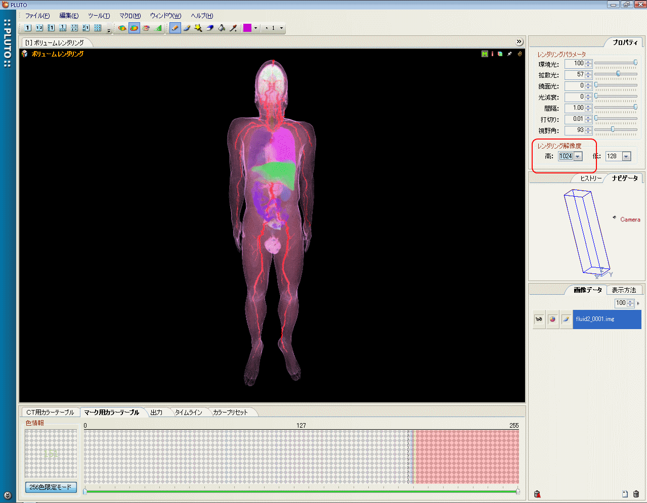 画像は,4種類ともRGBカラーのBMP形式の断面画像1687枚である.臓器領域,血管領域を抽出したデータも1687枚の断面画像である.これら,臓器領域,血管領域を抽出したデータを重ねあわせて,3次元表示を行うことをPLUTOを用いて行う.