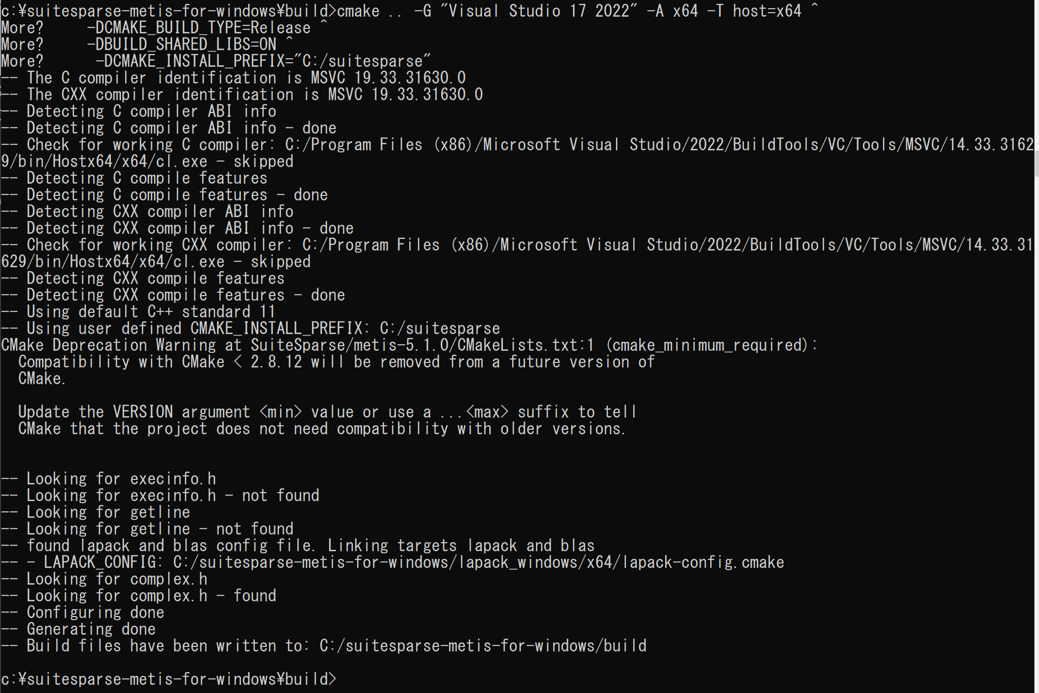 cd c:\ cd suitesparse-metis-for-windows rmdir /s /q build mkdir build cd build del CMakeCache.txt rmdir /s /q CMakeFiles\ cmake .. -G "Visual Studio 17 2022" -A x64 -T host=x64 ^ -DCMAKE_BUILD_TYPE=Release ^ -DBUILD_SHARED_LIBS=ON ^ -DCMAKE_INSTALL_PREFIX="C:/suitesparse"